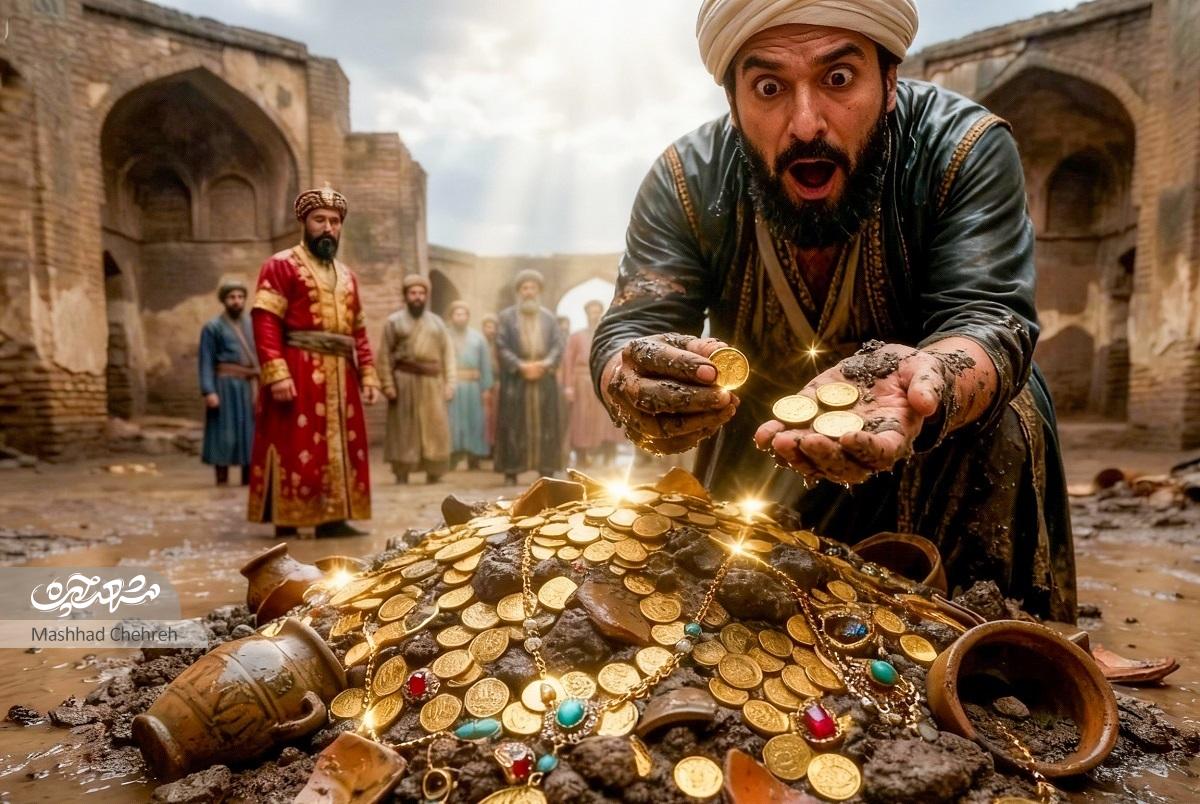 به هر گوشه که می‌نگریستی، ظرفی زرین یا سیمین از میان گل‌و‌لای بیرون زده بود و خودنمایی می‌کرد. خبر این اتفاق شگفت‌انگیز خیلی‌زود به روستا‌های اطراف رسید و در شهر مشهد هم منتشر شد و به این ترتیب، تب جویندگی طلا، منطقه را دربرگرفت.