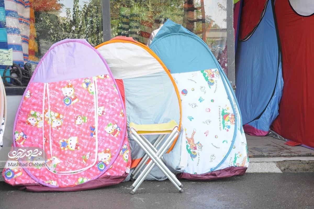 بچههای این راسته تابستانشان هم مثل فصلهای دیگر شلوغ نیست و این برایشان ناخوشایند است که با این شلوغی مشهد، تعداد مشتریها اینقدر کم باشد. دوست دارند در سوغات سفر مسافران از همین چادرهایی که حکم هتل را دارند، باشد. این را به خانوادهای میگویند که برای خرید آمدهاند. آنها بار ماشین را بستهاند و عازم یکی از شهرهای پر از شرجی و باصفای شمالاند. مرد خانواده که تابه حال لذت سفر با این چادرها را نچشیده است میترسد که این چادرها امن نباشد، اما اهالی این راسته خیالش را راحت میکنند.