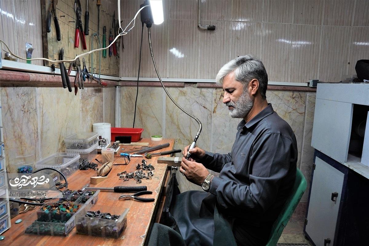 وارد کارگاه محمود صفرپور که میشویم، شلوغتر از آنی است که تصورش را میکردیم. حدود پانزدهنفر پشت میزها نشستهاند و هرکدام کاری انجام میدهند. یکی مواد را به قالبها تزریق میکند. یکی درحال سنبادهزدن انگشترهاست، دیگری نگینها را سوار میکند و.... صدای چرخها و دستگاهها چنان در فضا پیچیده است که باید بلندتر از حد معمول صحبت کنیم.