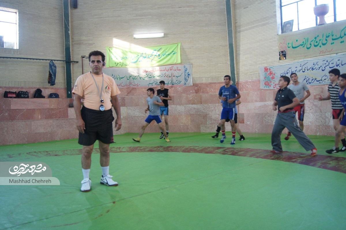 آنطور که شنیدهام بزرگمردی خیّر به اسم حاجغلامرضا باقرزاده باعث ساخت این مجموعه میشود، اگرچه مدتی طول میکشد، تا بالاخره دو سالن ساخته میشود؛ یکی برای ورزشهای توپی و یکی هم برای کشتی. اولین رشته این مجموعه همین کشتی است که به همت آموزش و پرورش ناحیه یک راه میافتد و آنطور میشود که حالا بهوقت تابستان ۹۱ وقتی وارد سالن میشوم، ۶۰ نوجوان و جوان را میبینم در حال گرمکردن. قاسم امینیفیلابی، پیشکسوت کشتی استان، کارشناس ارشد تربیتبدنی و مدرس دانشگاه دارد نرمش شاگردان روی تشک را اداره میکند. کمی که خلوت میشود، حرف میزنیم، از روزهای دور و نزدیک!