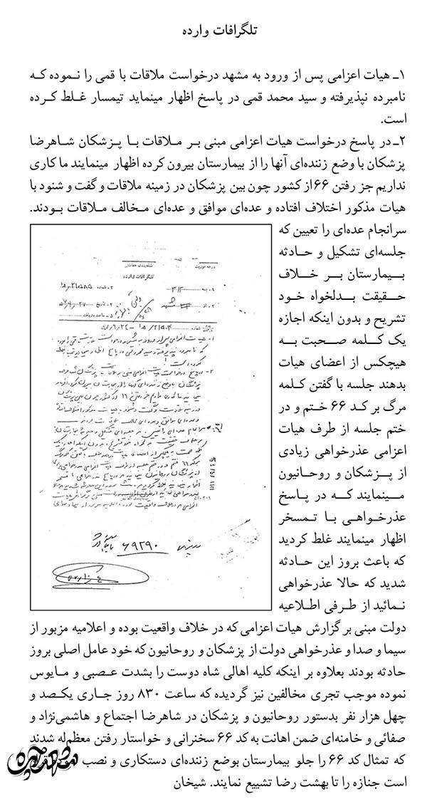 اما در سند محرمانه‌ای که تاریخ ۲۹ آذر ۵۷ پایین آن مهر خورده است، شیخان، رئیس ساواک مشهد، با اشاره به تخریب مجسمه شاه در مشهد چنین مخابره کرده است: «ساعت ۸:۳۰ دقیقه روز جاری یکصد و چهل هزار نفر به دستور روحانیون و پزشکان در شاهرضا اجتماع و هاشمی نژاد و خامنه‌ای و صفایی ضمن اهانت به کد ۶۶ سخنرانی و خواستار رفتن معظم له شدند که تمثال کد ۶۶ را جلوی بیمارستان به وضع زننده‌ای دستکاری و نصب نموده قرار است آن را مانند جنازه تا بهشت رضا تشییع نمایند.» ناگفته نماند که در تمامی اسناد باقی مانده از ساواک، نام شاه با عنوان «کد ۶۶» درج می‌شده است.