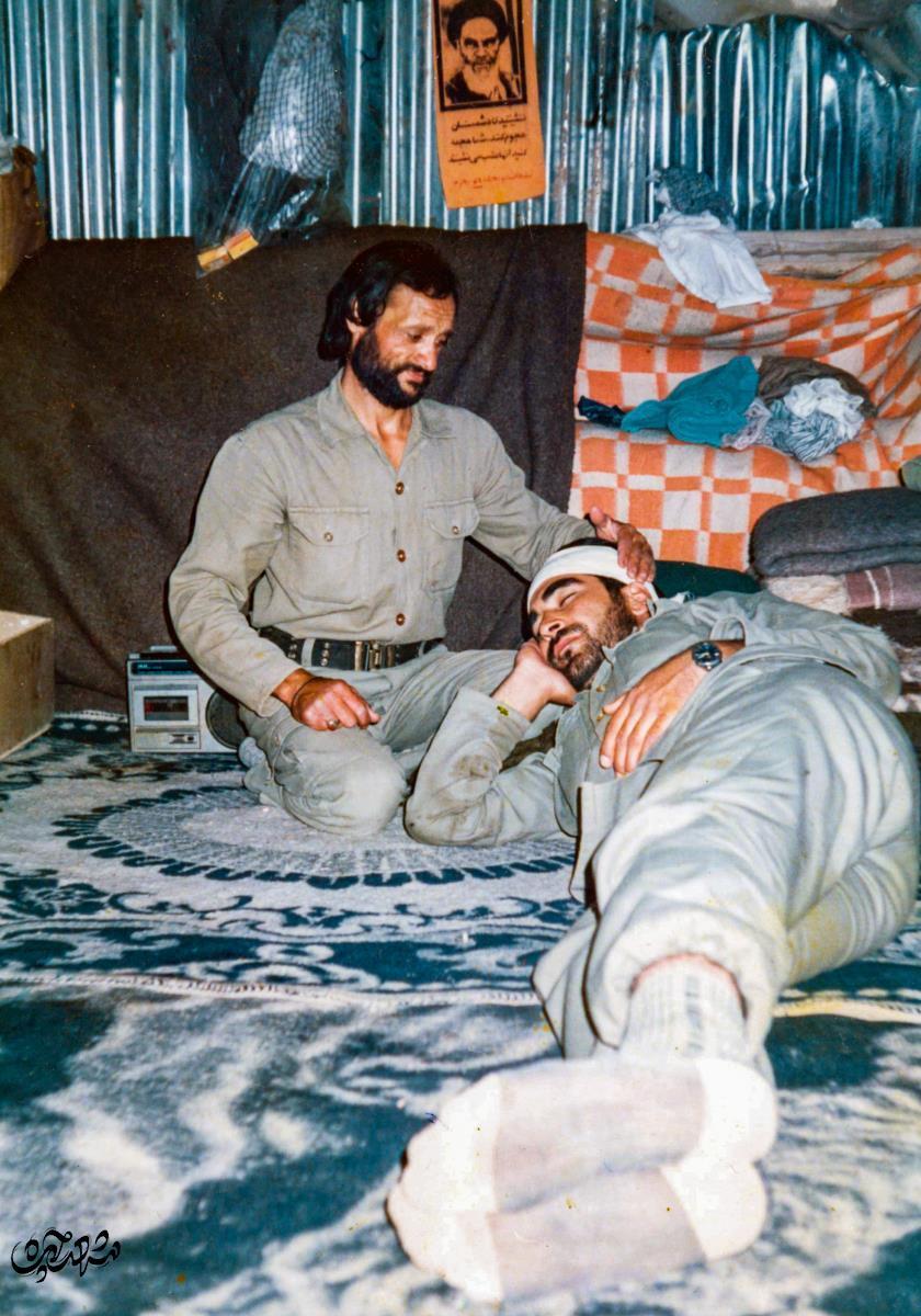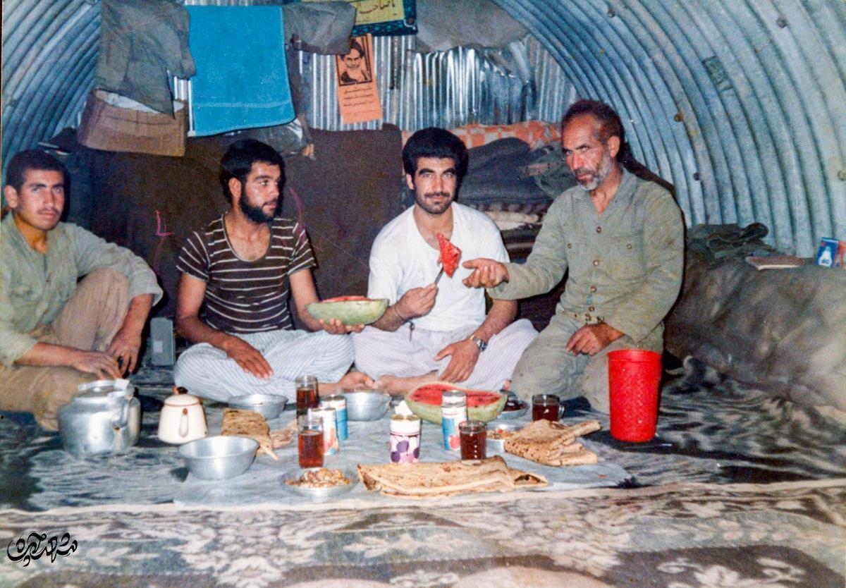 بعضیها میگفتند رزمنده ها در جبهه حسابی بساط بخور بخورشان به راه است. همسر فاطمه خانم آن آقایی است که لباس سپید به تن دارد. او این عکس را فرستاده و گفته است این تصویر را به آنهایی که میگویند سفره افطارمان رنگارنگ است نشان بدهید. ما با نان و پنیر و هندوانه روزه مان را باز میکنیم.