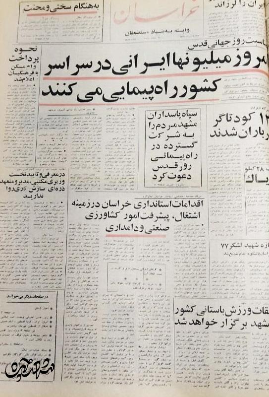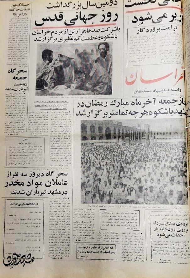 روز قدس، خبرنگار روزنامه «خراسان» گزارش می‌دهد که زنان و مردان بسیاری از دو روز پیش به قصد شرکت در راهپیمایی، با پای پیاده از روستا‌های اطراف راهی مشهد شده اند و می‌گوید: «نماز وحدت آفرین جمعه به واسطه آخرین جمعه ماه مبارک رمضان و تقارن آن با روز بزرگداشت جهانی قدس از عظمت و شکوه قابل تحسین برخوردار بود.
