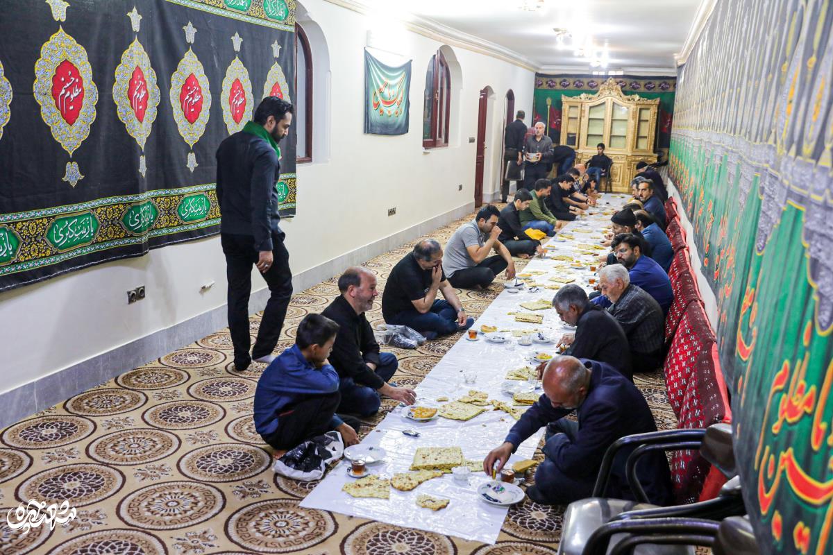 سفرههای صبحانه از همان ساعت6 صبح پهن میشود و هر روز دو، سه نفر از بچهها مسئول خرید نان تازه هستند، همسایهها نیز برای پذیرایی از مهمانان کمک میکنند. برخی عزاداران با بردن تکه نانی برای شفای مریض و برخی هم با خوردن چای روضه به دنبال گرفتن حاجت خود هستند، محمدتقی عابدینزاده بارها از اهالی شنیده که از این مجلس حاجت گرفتهاند او این موضوع را نشانه نگاه و لطف حضرت به این روضه خانگی میداند.
